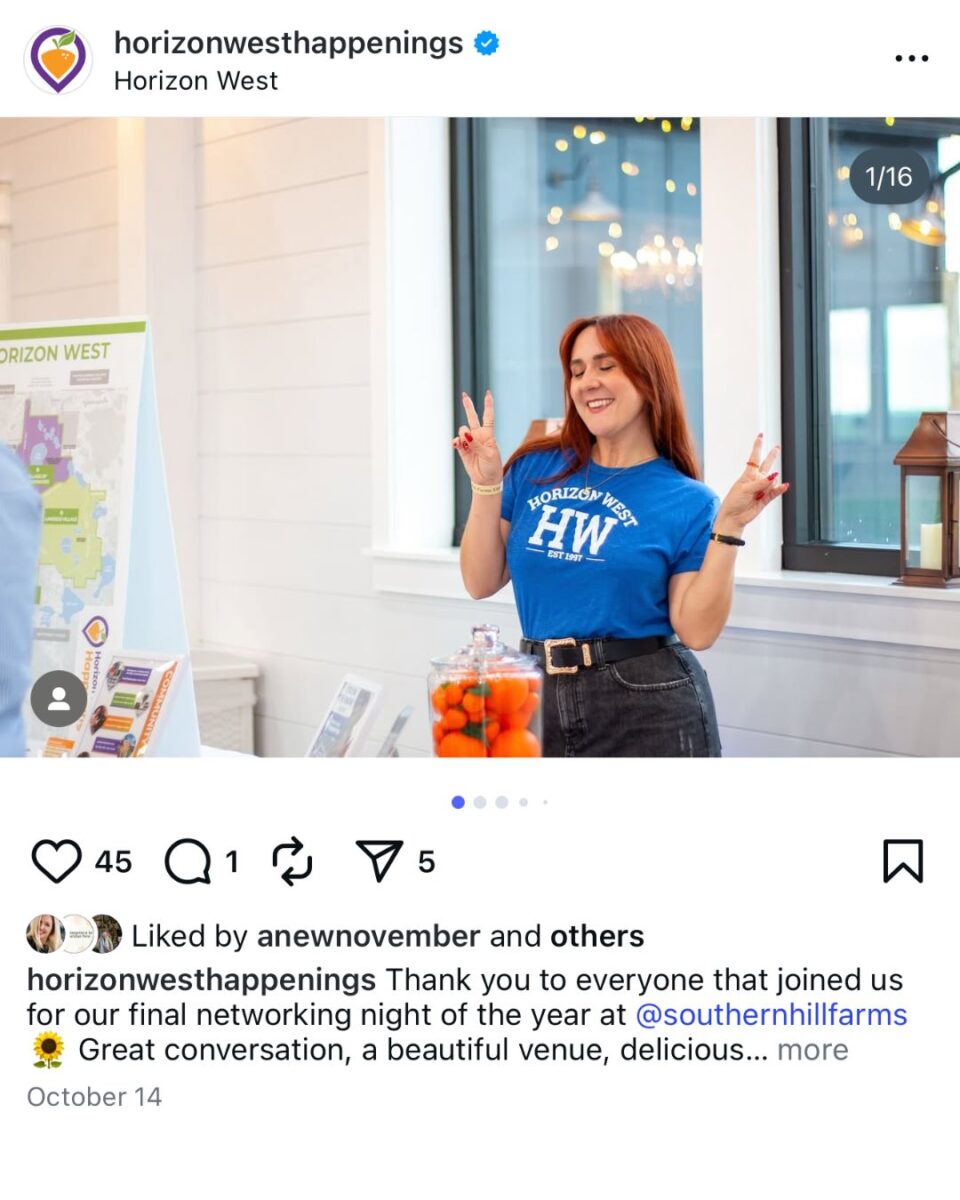 Our website, community group on Facebook, and Instagram keep you in-the-know on all things Horizon West. You’ll find all the “happenings” right here in one convenient hub. If you want to know what’s happening this weekend, or what’s coming later this year, you’ll find it on our platforms. Events, clubs, community service, businesses, services, and entertainment are all part of our vibrant community. Support local alongside us and share in shaping our Horizon West!