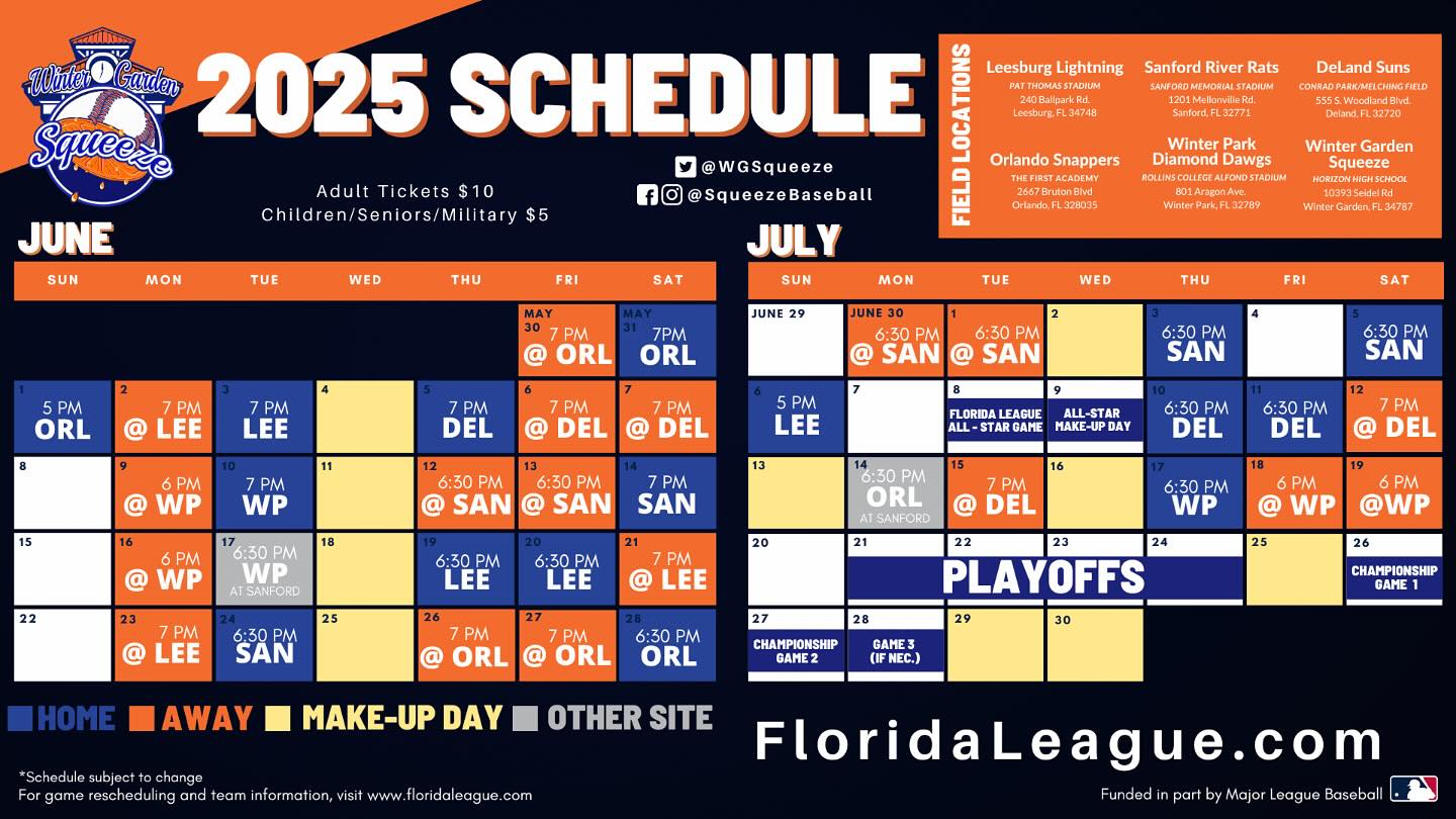 The Florida Collegiate Summer League has six teams throughout Central Florida, the others located in Deland, Leesburg, Orlando, Sanford and Winter Park. College players from around the country flock to leagues like the FCSL to sharpen their skills and hope to gain attention from scouts. For the Squeeze players, Horizon West will now be a part of their baseball journey.