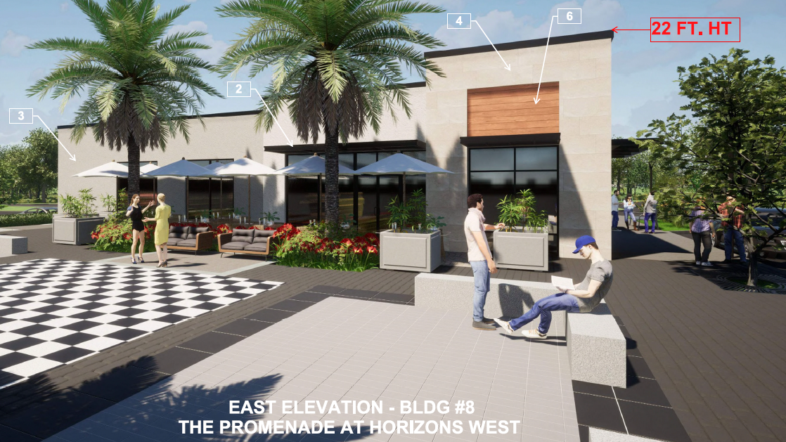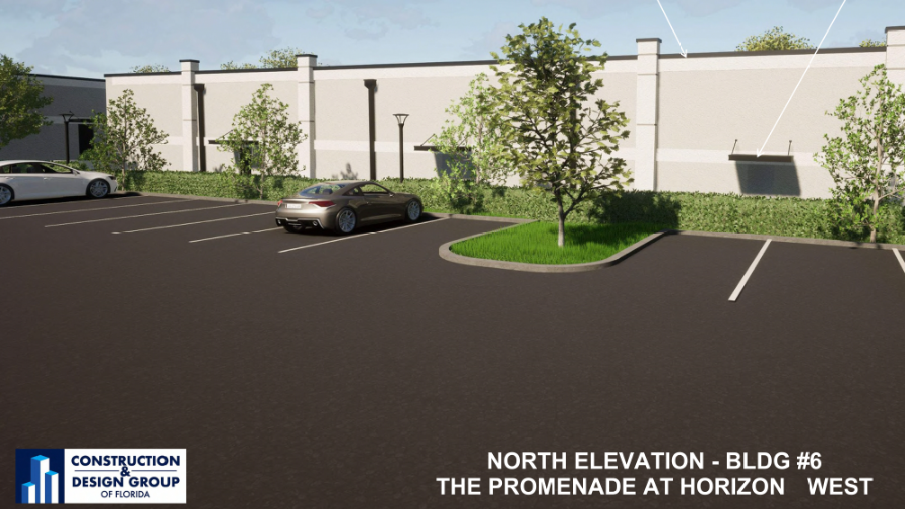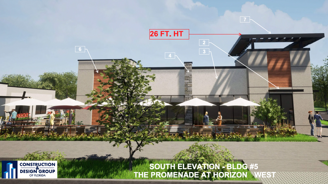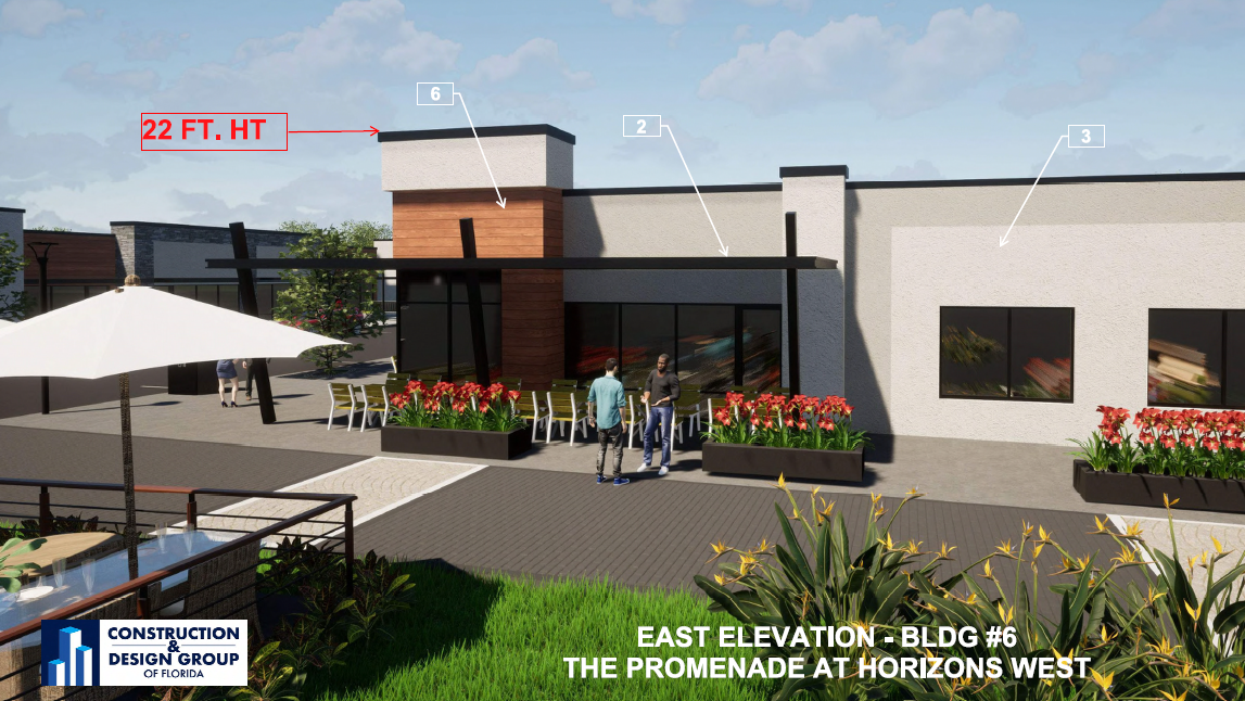 Construction & Design Group of Florida are the architects for this project. The submission to Orange County includes their proposed renderings of the property, some of which are shown on this page. Submitted images show a clean and sophisticated look and feel that is similar to other nearby Horizon West developments. Presented features show on-street parking, parking lots, pedestrian walkways between buildings, various styles of storefronts, opportunities for restaurants with patio seating and outdoor courtyards, surrounded by lush landscaping.